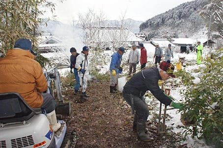 今月17日には、 雪の中、 日役を実施。 足元をならして草を刈り、 通路横にロープを張るなどの作業に力を合わせた。