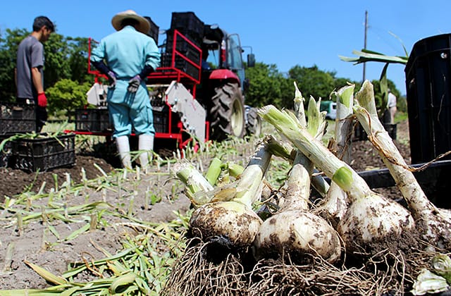 兵庫県丹波市内で栽培面積が広がっているニンニクの収穫が始まった。5月22日には同市春日町野上野の農地で作業が行われ、冬を越え大きく実ったニンニクが次々と掘り起こされた。