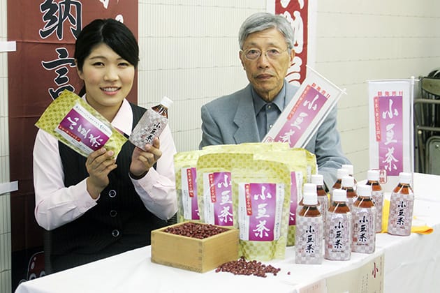新発売の「小豆茶」をPRするJA職員と開発協力者の細谷名誉教授=兵庫県丹波市氷上町市辺で