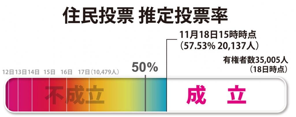 住民投票の推定投票率(期日前含む)は15時時点で57.53%(2万137人)。