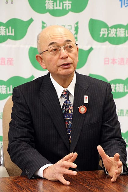 今月10日告示の兵庫県篠山市長選で、無投票で5選4期目を決めた現職の酒井隆明市長が12日、篠山市役所で報道陣のインタビューに答えた。同市は昨年11月に行われた住民投票を経て、5月1日から「丹波篠山市」に市名変更する。