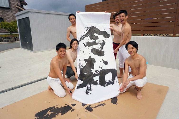 同級生たちは伏田さんの自宅で着替え、上半身裸のももひき姿で登場。逆さになった伏田さんを4人で抱え、墨汁がたっぷり入ったバケツに頭をドボン。「令」の1画目から書き始めた。