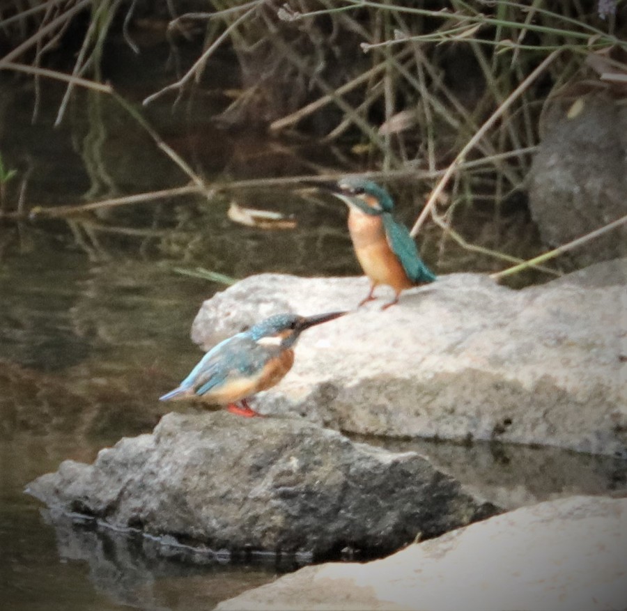 小野橋の上を野鳥の撮影スポットにしている横谷さん。15日午前7時半ごろ、双眼鏡で岩の上に2羽のカワセミがいるのを確認し、急いで400ミリ望遠レンズのカメラに持ち替えて撮影した。メスは下くちばしが赤く、オスは上下とも黒色をしているため、雌雄と分かったという。