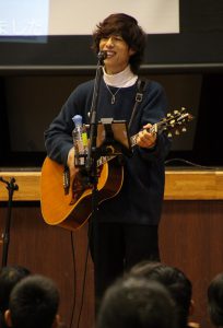 自身が子どものとき、阪神・淡路の街頭募金をした際に、「ありがとう。おっちゃん、元気が出たわ」と言われたエピソードを踏まえ、児童たちに、「子どもにはすごい力がある。がんばることでみんなにも笑顔の連鎖を起こすことができる」と呼びかけ、被災地で生まれた「しあわせ運べるように」を歌った。