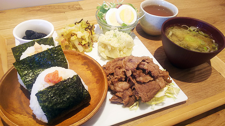 6種類の中から2種を選ぶ無農薬米のおにぎりと有機野菜の日替わりランチセットは1280円(税込み)。平日は、ドリンクが付く。ケーキとドリンクセットは900円(同)。