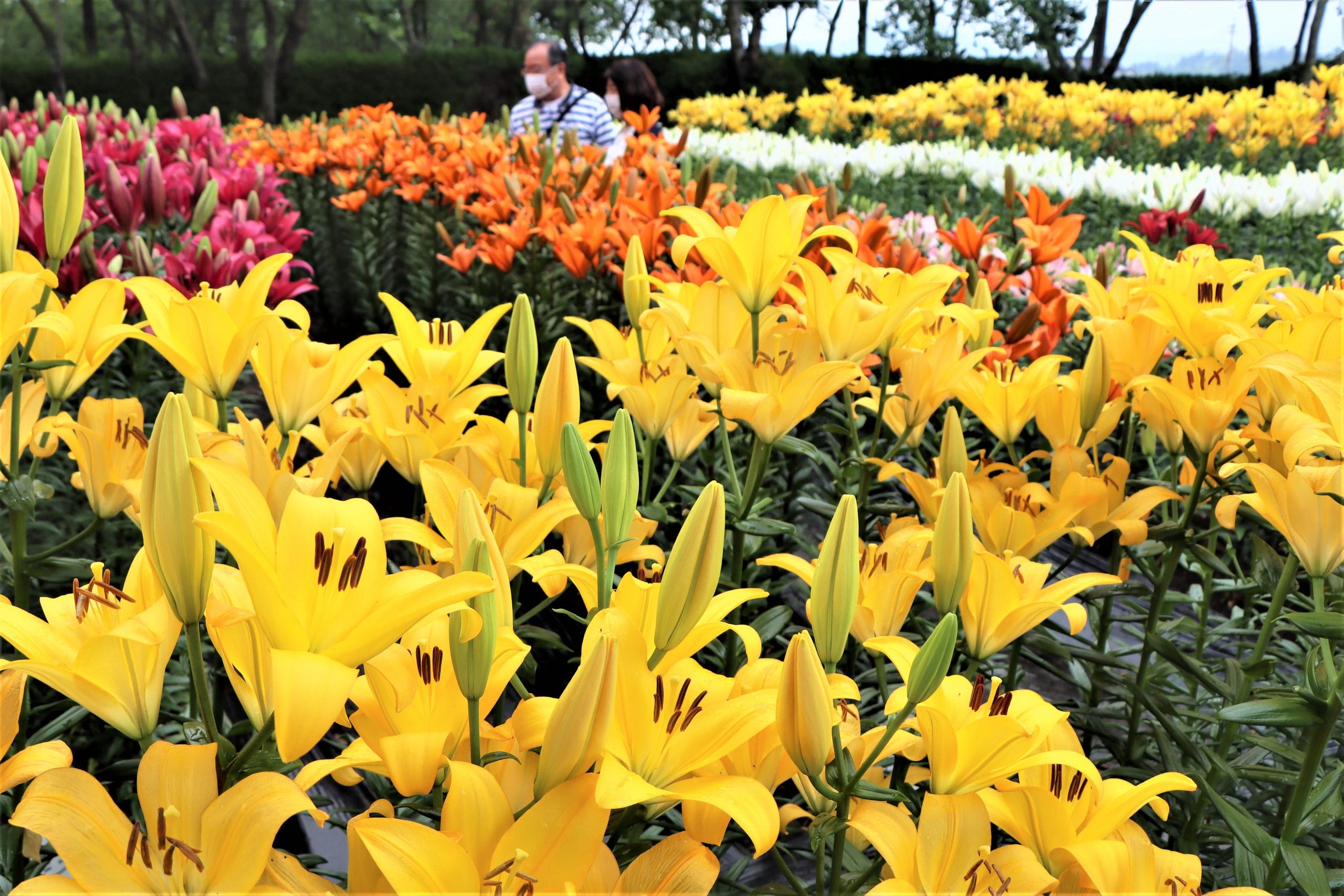 兵庫県丹波篠山市黒岡にある「篠山玉水ゆり園・あじさい園」のユリが見ごろを迎えている。黄、白、ピンク、オレンジ、赤など約60種10万本が植えられており、灰色がかった梅雨空の下にあって色鮮やかな大輪を開かせている。7月上旬まで楽しめるという。