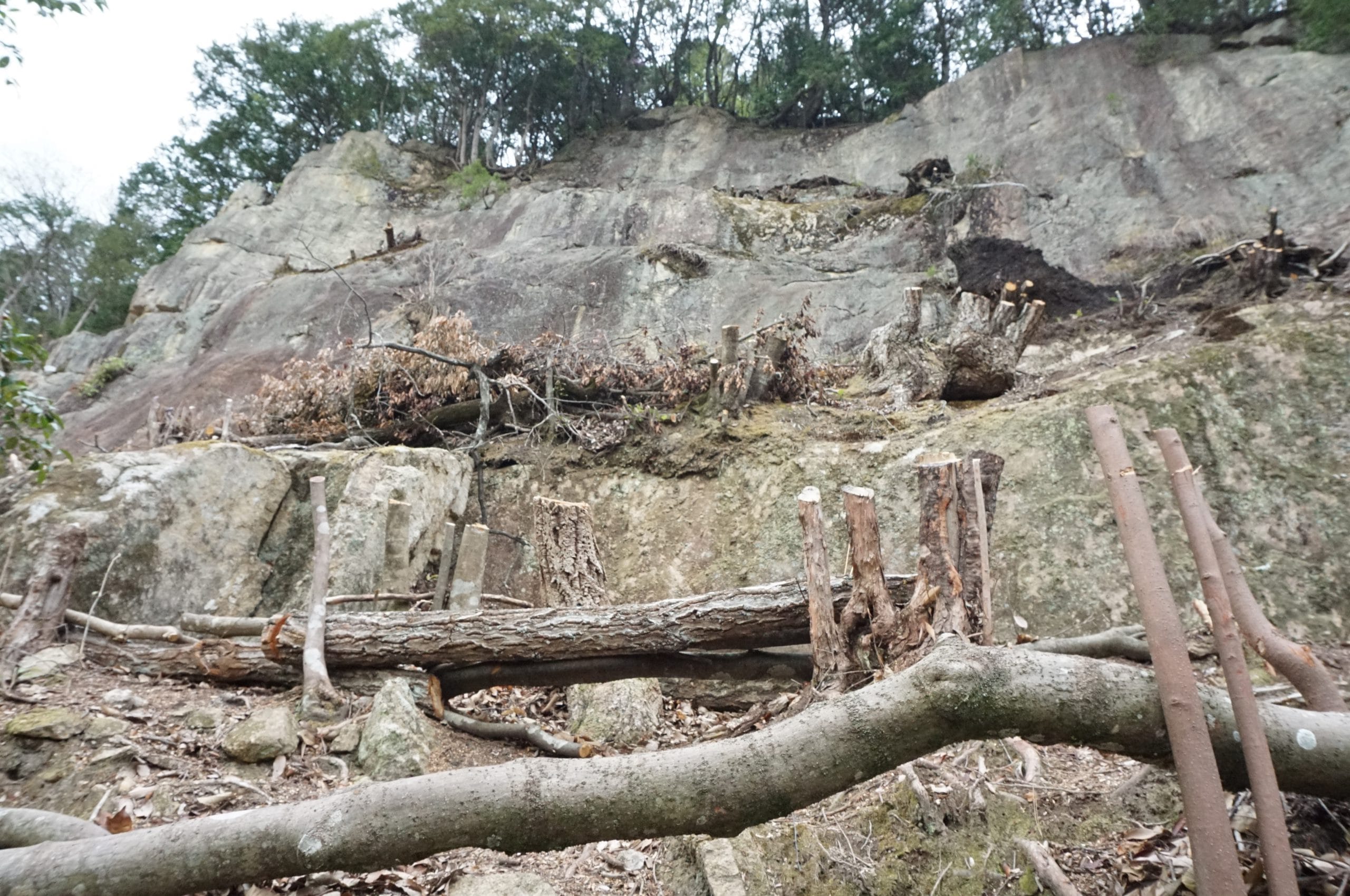 「植林された木には手を付けられない」と、スギ、ヒノキ、マツ以外を伐採。岩の側面に生えていた木も含め、「切った木は何本か分からない」ほど汗を流した。