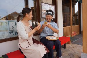 種類は、しょうゆの香ばしい香りが懐かしい「醤油」(180円)、細かく砕いた黒豆の煎り豆をまぶした新食感の「黒豆味噌」、収穫時期にこだわった柔らかい実を使い、爽やかな香りが楽しめる「実山椒」、考案者の阪本勝さんが「子どもにも食べてもらいたい」と、どうしてもラインナップに入れかった「桜えび」(以上、280円)の4つ。出来たてを軒下のベンチでも味わえる。