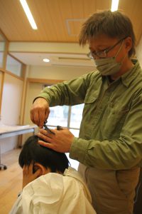 27歳の時、近くの障がい者支援施設「みつみ学苑」から「髪を切ってほしい」と頼まれたのがきっかけ。同施設運営法人の障がい児支援専門施設「春日学園」にも出張するようになった。身近に発達障がいの子がおり、障がい理解の療育研修にたびたび足を運び、障害特性に応じて個別対応する必要性を学び、理容現場に応用した。