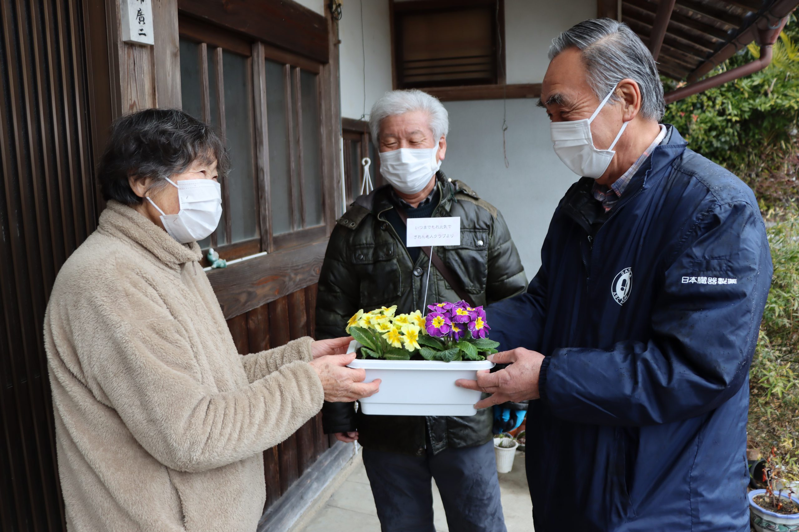 会員の見守り活動「友愛訪問」の一環。同クラブの向井会長(73)と山本晴朗副会長(70)が、色のバリエーションが豊富な品種「プリムラ・ジュリアン」が植わったプランターを1つずつ届けて回った。
