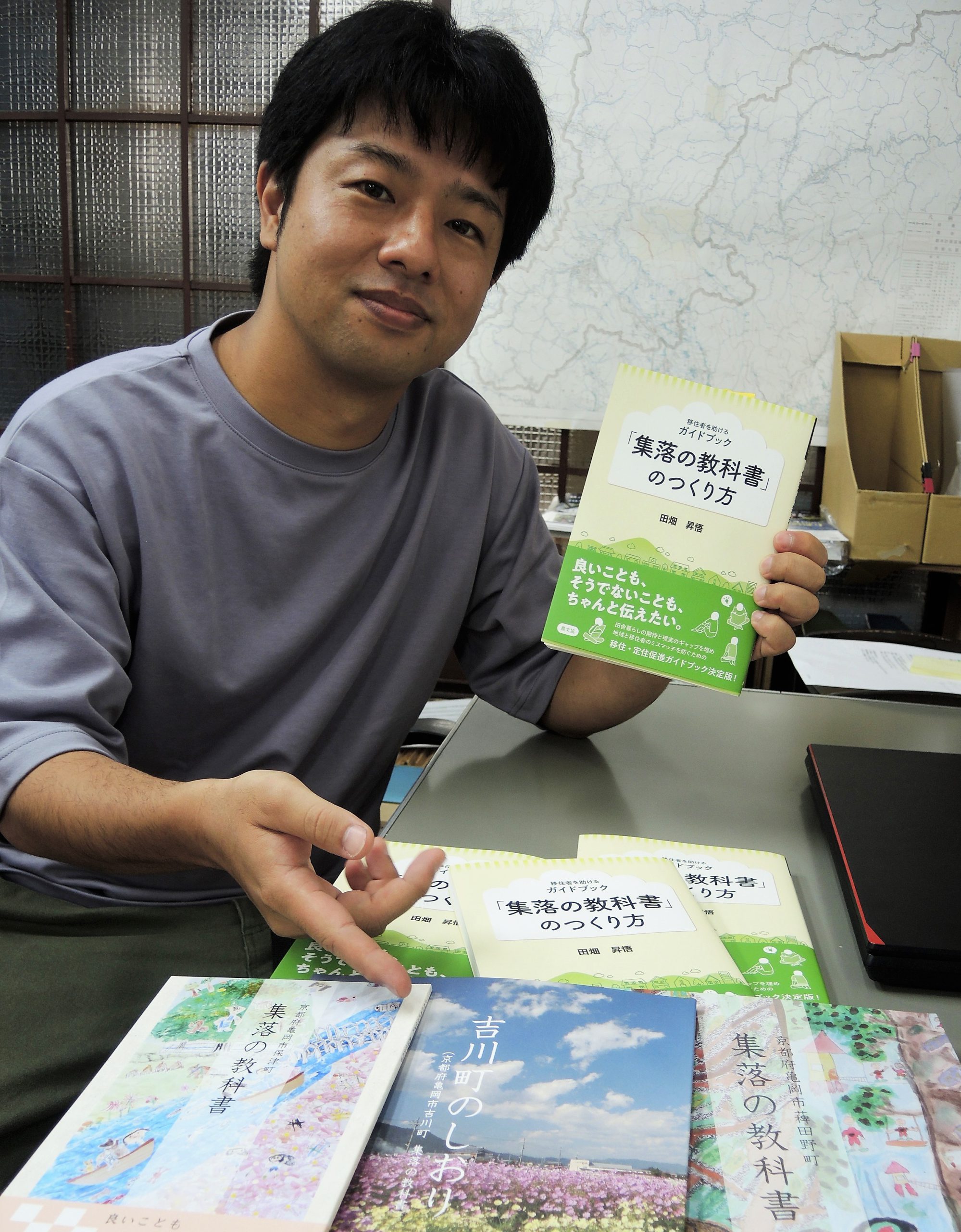 田畑さんは、南丹市にあるNPO法人テダスの事務局長。2014年に同市の世木地域から移住希望者に向けたガイドブック作成の依頼を受けた。地元振興会との初めての会議で、「良いことだけでなく、都会の人には不合理と思われかねないことも載せましょう」と提案。出席者から「地域のイメージが悪くなる」との反対があったが、「このままでは現状は変わらない。挑戦してみよう」との声が上がり、全国で初の取り組みという教科書を編集。A5判、50ページにまとめた。