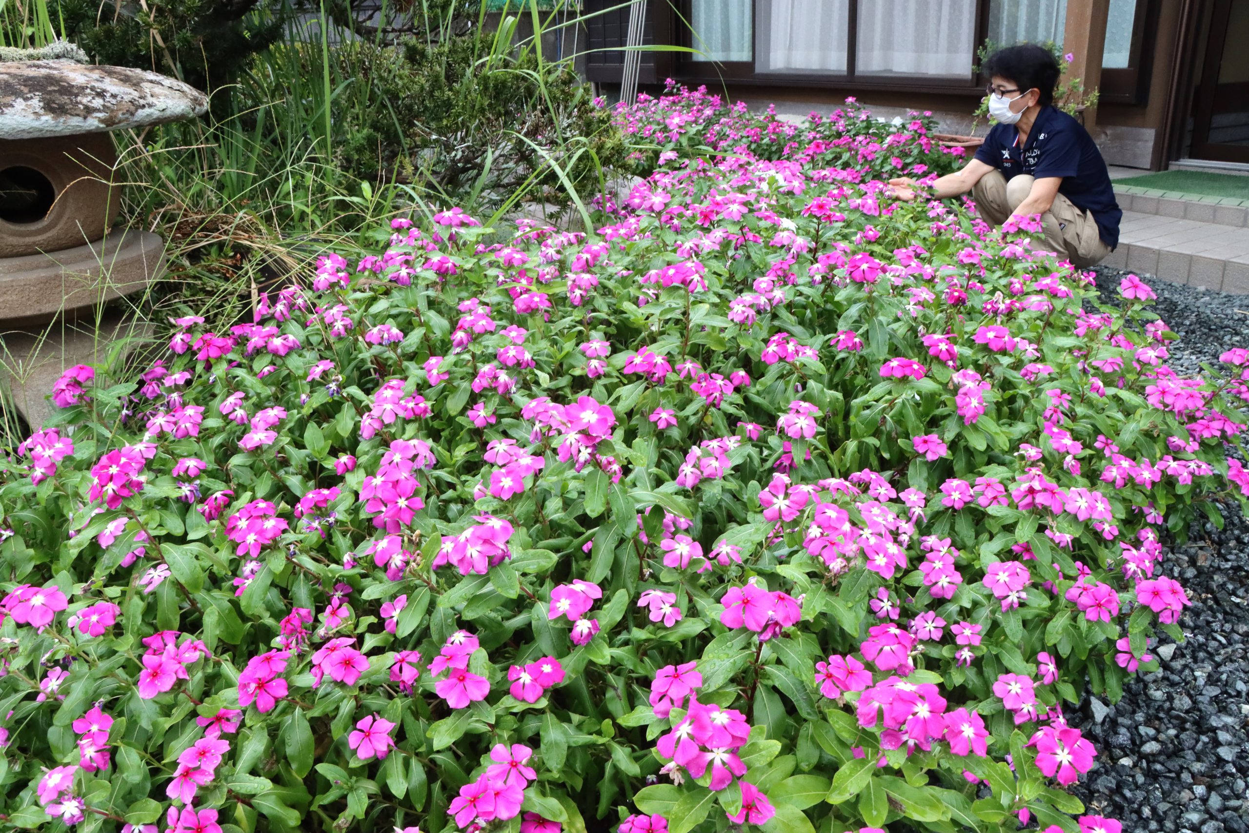 藤本さんによると、縁側で育てていたニチニチソウの種が風で飛ばされ、庭に落ちたという。以来、落ちた場所から自然と花が咲くように。今年は縁側から庭、さらには玄関前まで範囲を広げている。開花後には肥料をまき、除草剤をまかないように気を付けている。