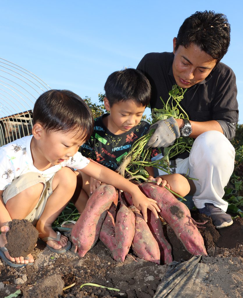 自宅の畑で採れ、1株に9個がつながったサツマイモを見つめる聡志さんと子どもたち=兵庫県丹波篠山市大山下で