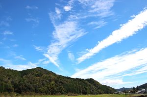 同市の秋の味覚「丹波篠山黒枝豆」の畑の上空に目を向けると、刷毛で描いたような雲と抜けるような青空が広がる。