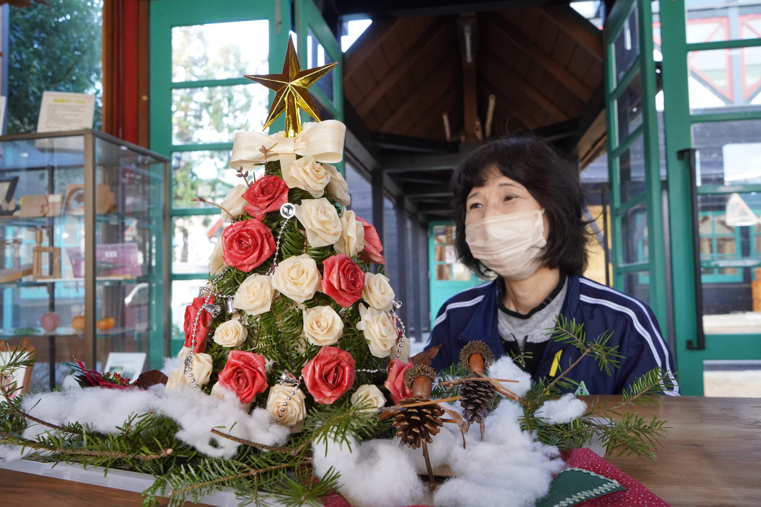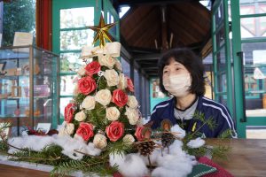 新地さんは、「今はアクリル絵の具でバラを赤く塗っているが、今後は、草木などの天然素材でカンナくずを染め、色とりどりのバラを作っていけたら」と話している。