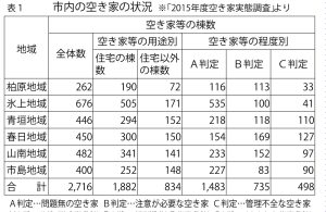 実態調査の基礎資料を集めるため、昨年度、自治会に状況調査を依頼。1629戸と報告があった=表2。14年度に同趣旨で行った調査時より、391戸、約32%増加。柏原以外の旧町域で増えた。自治会調査では、うち60%が「適正管理」と判定された。14年調査時は70%が「適正管理」だった。自治会役員の主観による分類であり、評価の厳密性を割り引いても、適正管理の割合は低下傾向。