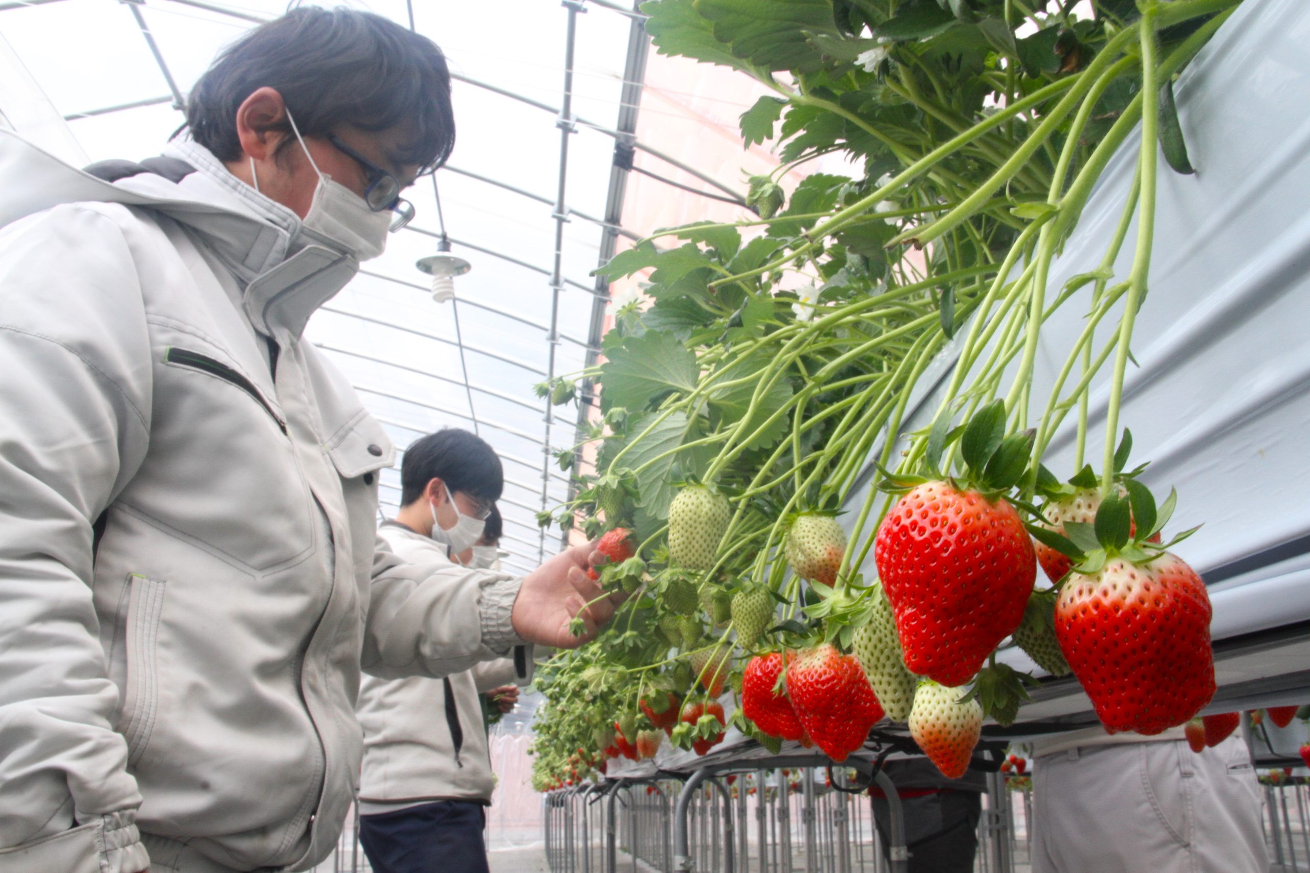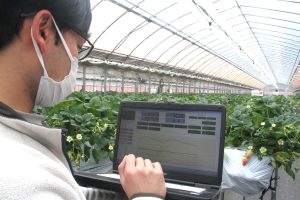 新規参入する生産者の研修の場の役割があり、ハウス内の気温、湿度、二酸化炭素濃度、日照量、地温を計測し、理想値に近づける「環境制御システム」を導入。数値で「見える化」をはかることで、ハウス内を光合成が進みやすい二酸化炭素濃度に調整したり、イチゴにストレスを与える室温の急激なアップダウンを抑えるといった栽培管理に役立てている。1人が独立開業し、現在2人が研修中。