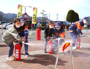 水消火器の体験では、参加者が数メートル先に設置した炎のイラストが描かれた金属板(火点)めがけて勢い良く水を噴射させた。小さな子どもからも人気があり、分団員から使い方を教わると、真剣な表情で火点に向けて放水していた。