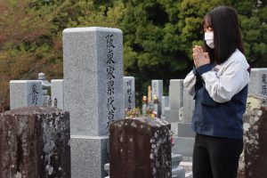その後、座禅に挑戦したほか、阪東家の墓に参り、手を合わせて入社と決意を報告した。