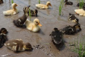 兵庫県丹波市山南町の認定こども園みつみの5歳児組の園児37人が22日、同町上滝の水田でアイガモの放鳥を体験した。「ぴいぴい」と鳴きながら泳ぐ愛らしい姿に、園児たちは「かわいい」「ふわふわ」とメロメロになっていた。