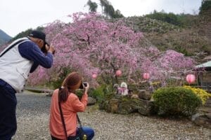 このサクラの名所には観光バスのほか、今年は外国人が増えているという。ペット連れも近年増加。3匹のイヌとシダレザクラの撮影を楽しんでいた女性は「境内一面に咲くサクラがきれい」と話していた。
