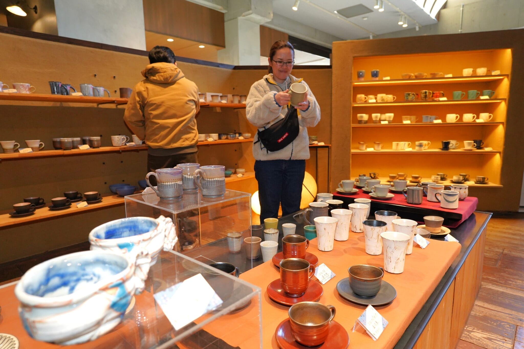 スリップウェアで模様を描いた七寸皿や、わら灰釉をかけて焼き上げたしのぎの造形が美しいそばちょこなど伝統技法を駆使した作品から、デフォルメされた真っ赤な鯛がぎっしりと描かれた大鉢、花唐草紋のマグカップなど、女性ならではの柔らかな雰囲気が漂う食器の数々が展示され、来場者を楽しませている。