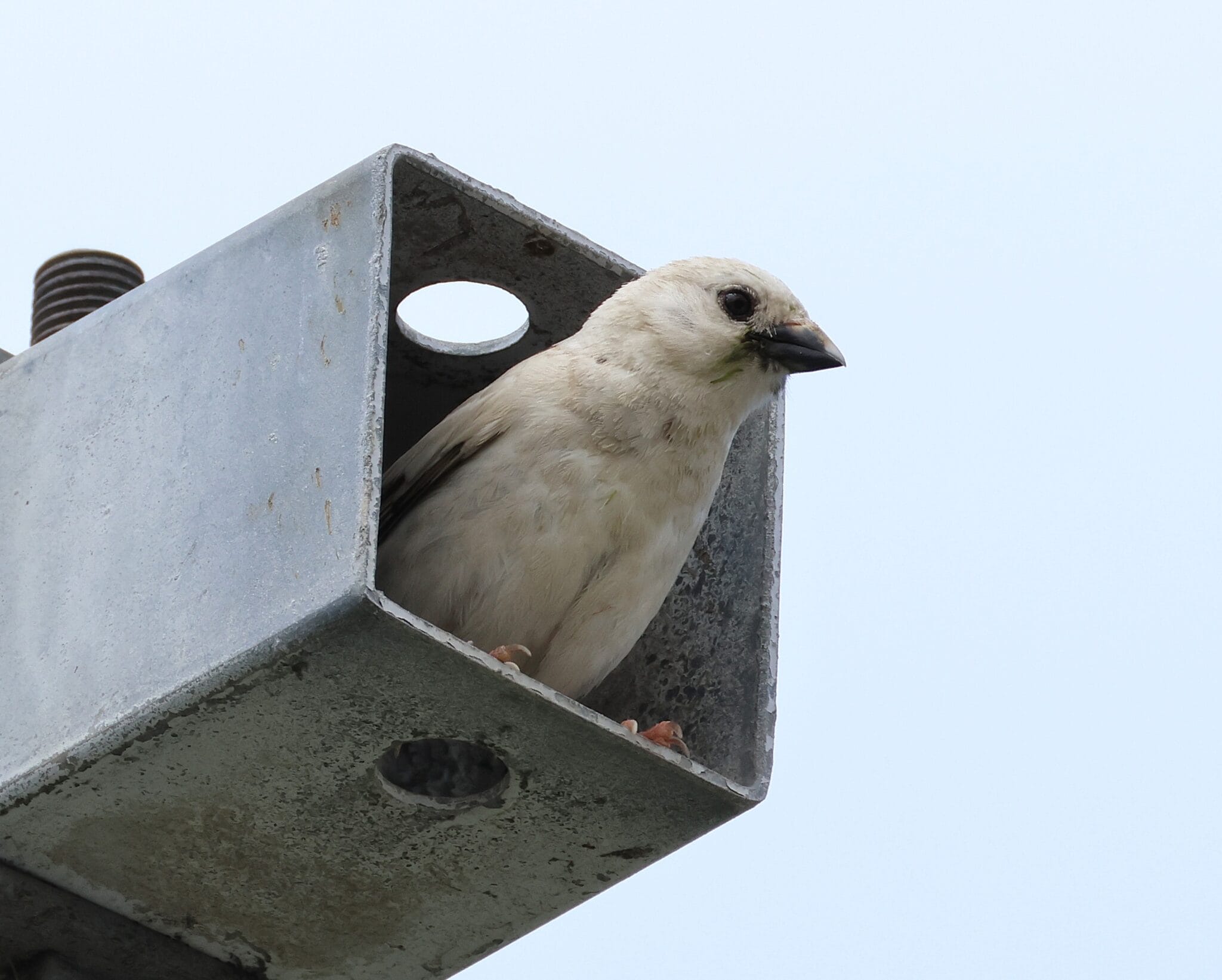 巣の中から出てきた白スズメ。すぐに飛び去り、ごはんをくわえて戻って来る。つがいでゆっくりする暇もなく、子育てに大忙しだ=2025年6月4日午前10時23分、兵庫県丹波篠山市内で