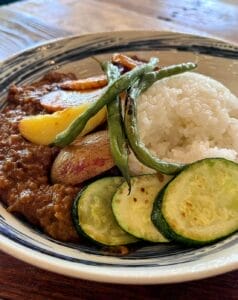 カフェメニューは、冷たい米粉うどん(600円)、農家さんピザトースト(同)、米粉シフォンケーキ(500円)、自然栽培コーヒー(600円)など。中でもおすすめは、季節の野菜乗せスパイシー無水カレー(1400円)=いずれも税込み=。自然栽培のタマネギをふんだんに使い、酵母エキスなしのオリジナルカレールーでスパイシーに仕上げた一品。ビーガンに対応しており、使用する野菜は季節により異なる。