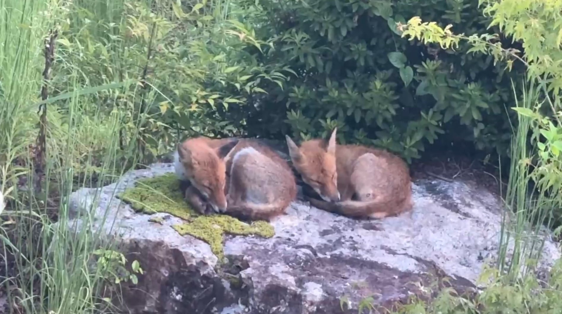 庭の石の上ですやすやと眠る2匹のキツネ=2025年9月11日午前5時30分、兵庫県丹波市春日町多利で