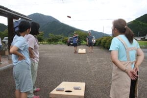 8・23メートル離れた台を目がけビーンバッグを投げる「コーンホール」=兵庫県丹波市青垣町桧倉で