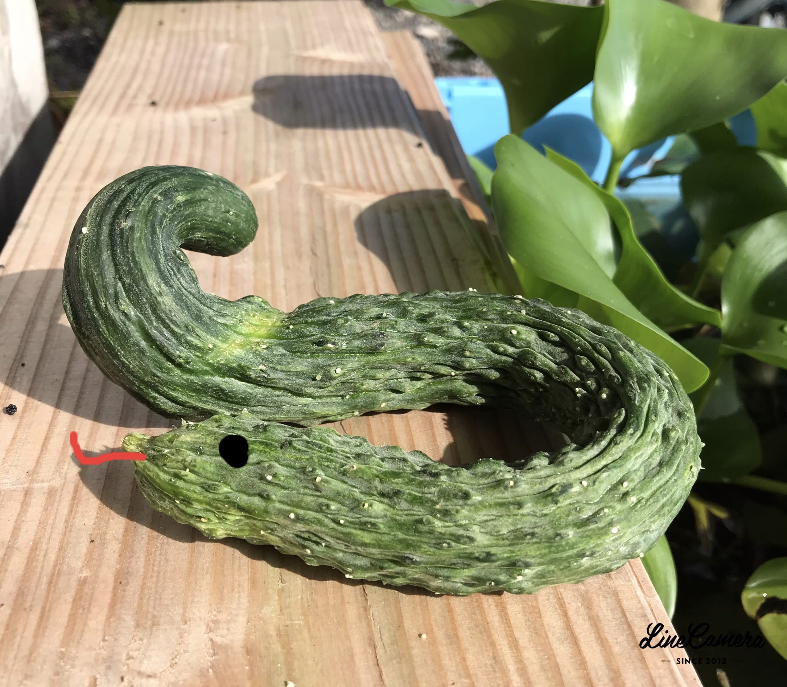 大蛇? クネクネ曲がったキュウリ 遊び心で目と舌をプラス